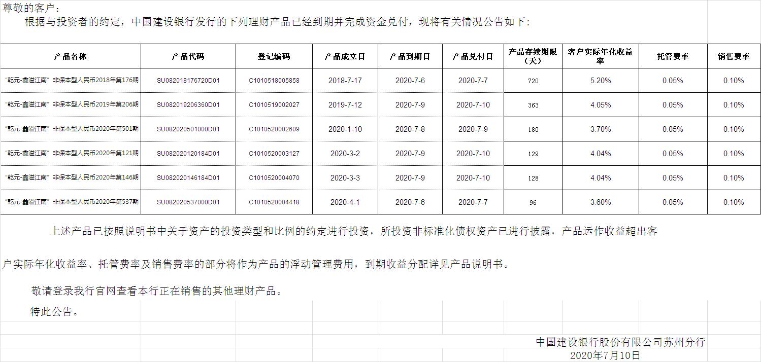 中国建设银行理财产品终止及清算公告